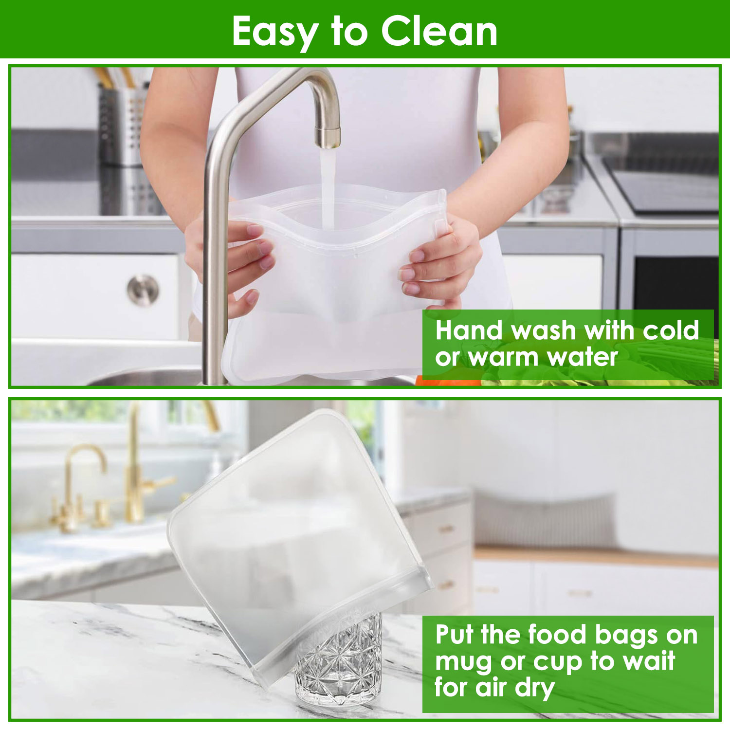 *Easy To Clean*:Our reusable bags are easy to clean,cold and warm water are both supported when washing. Put the food bags on mug or cup to wait for air drying. Please notice that dishwasher is not supported.
