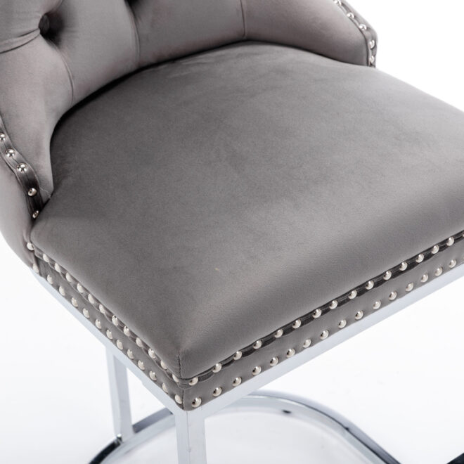 This Velvet Chrome Bar stools featuring a very modern mid-century look,numbers of decorative rivets are inlaid around the cushion and backrest, which looks more noble and elegant. The high back with deep button tufted design gives the whole chair a delicate and luxurious feel.