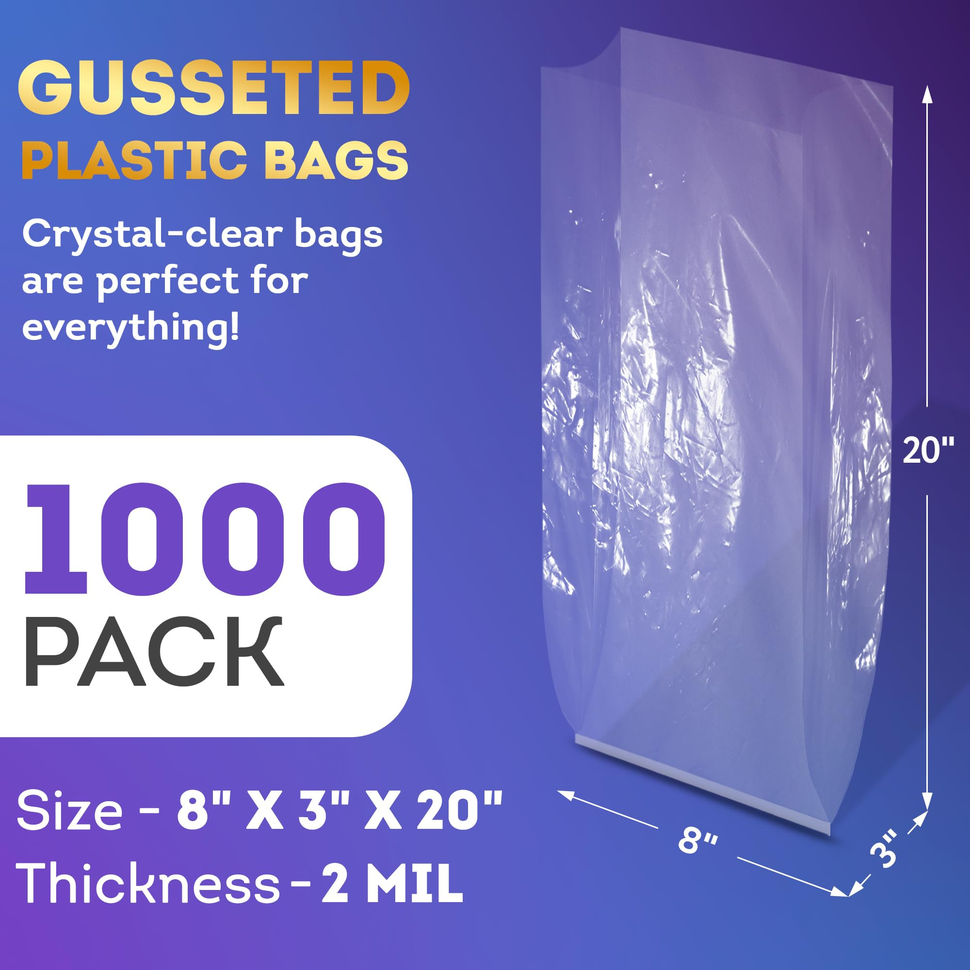 Clear Gusseted Poly Bags, 8 x 3 x 20 Inches. Pack of 1000 Waterproof Flat Bottom Gusseted Plastic Bags with Open Top. 2 Mil Thick Party Clear Plastic Bags for Packaging Popcorn, Cookies, Bread