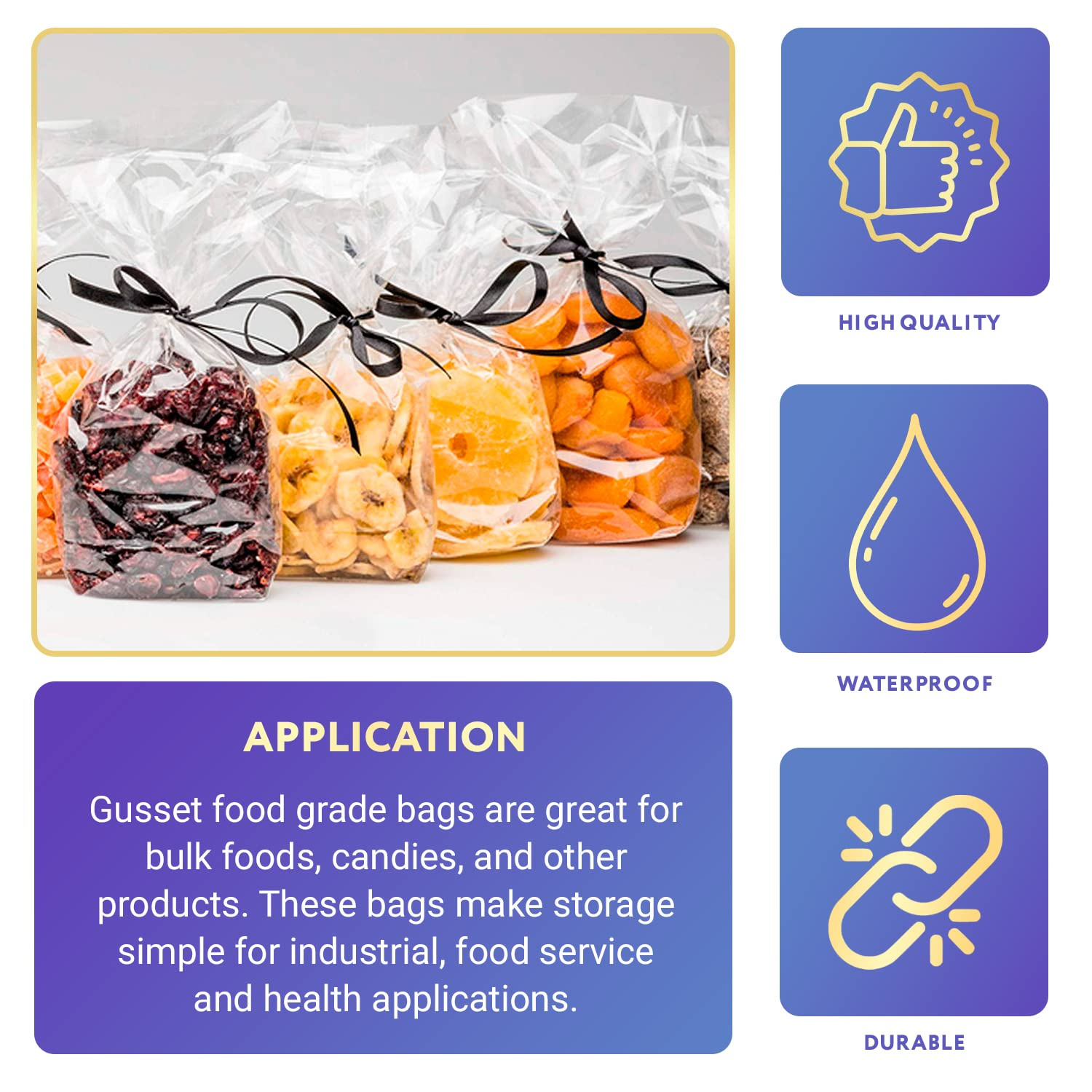 3.Well-Made and Tear-Resistant. The gusseted sides of the clear plastic gift bags open out to provide more space. These clear plastic bags for gifts have durable sealed seams and can hold a lot of food without tearing.