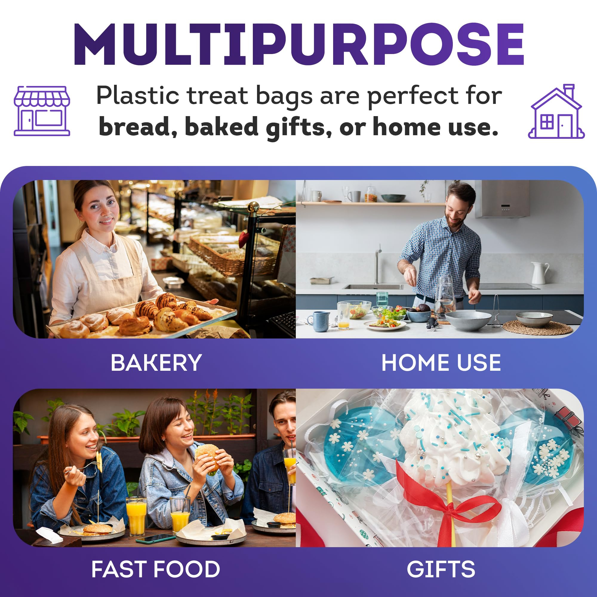 5.Useful for Many Things. Flat bottom gusset bags clear will be an excellent choice for both small business and for use in your household. Clear party bags are great for packing baked treats, bread dough, lunches and snacks.