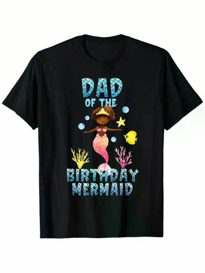 Mens Dad Of The Birthday Mermaid African American Mermaid Women T-Shirt, 100% Cotton, Single Side Printed