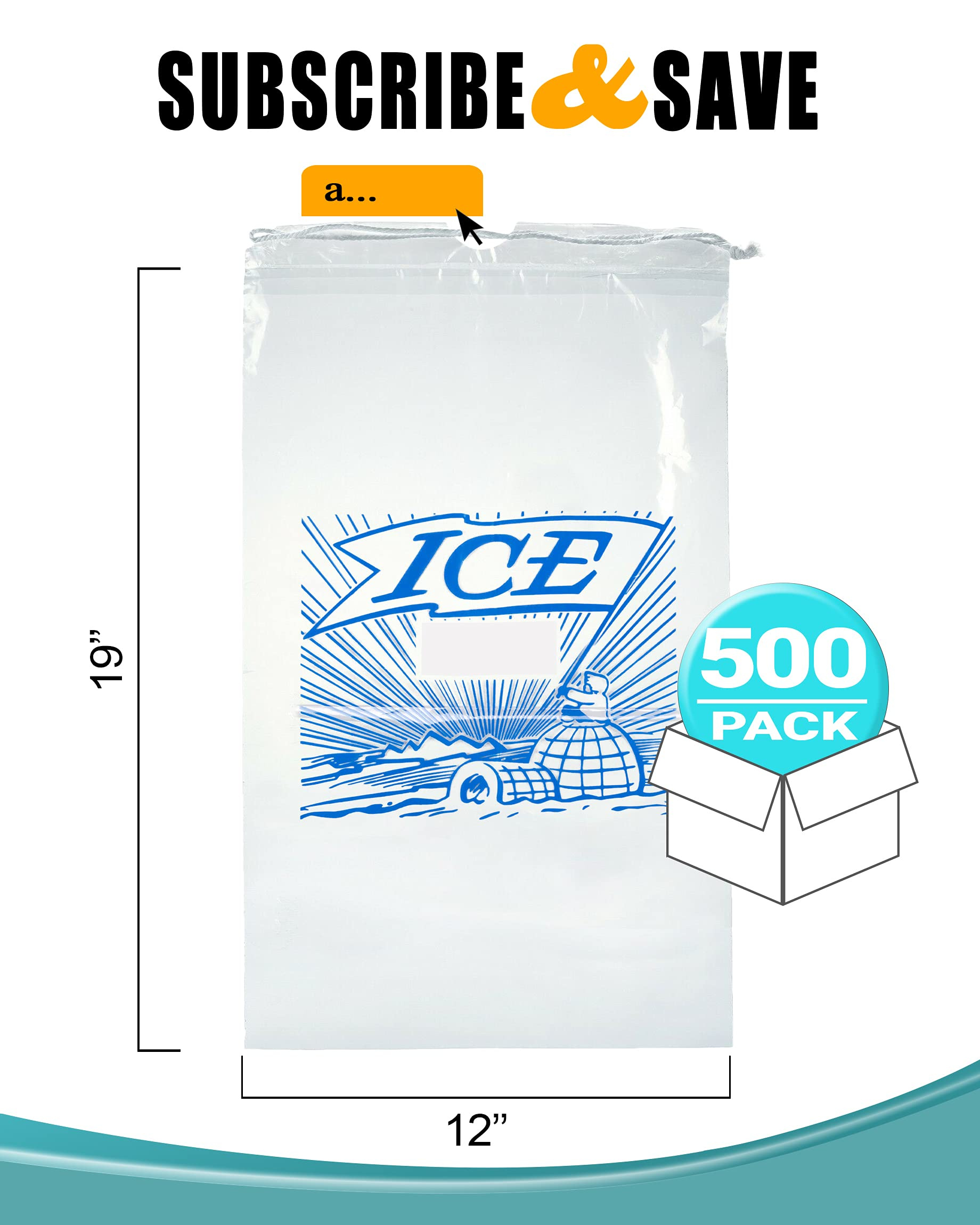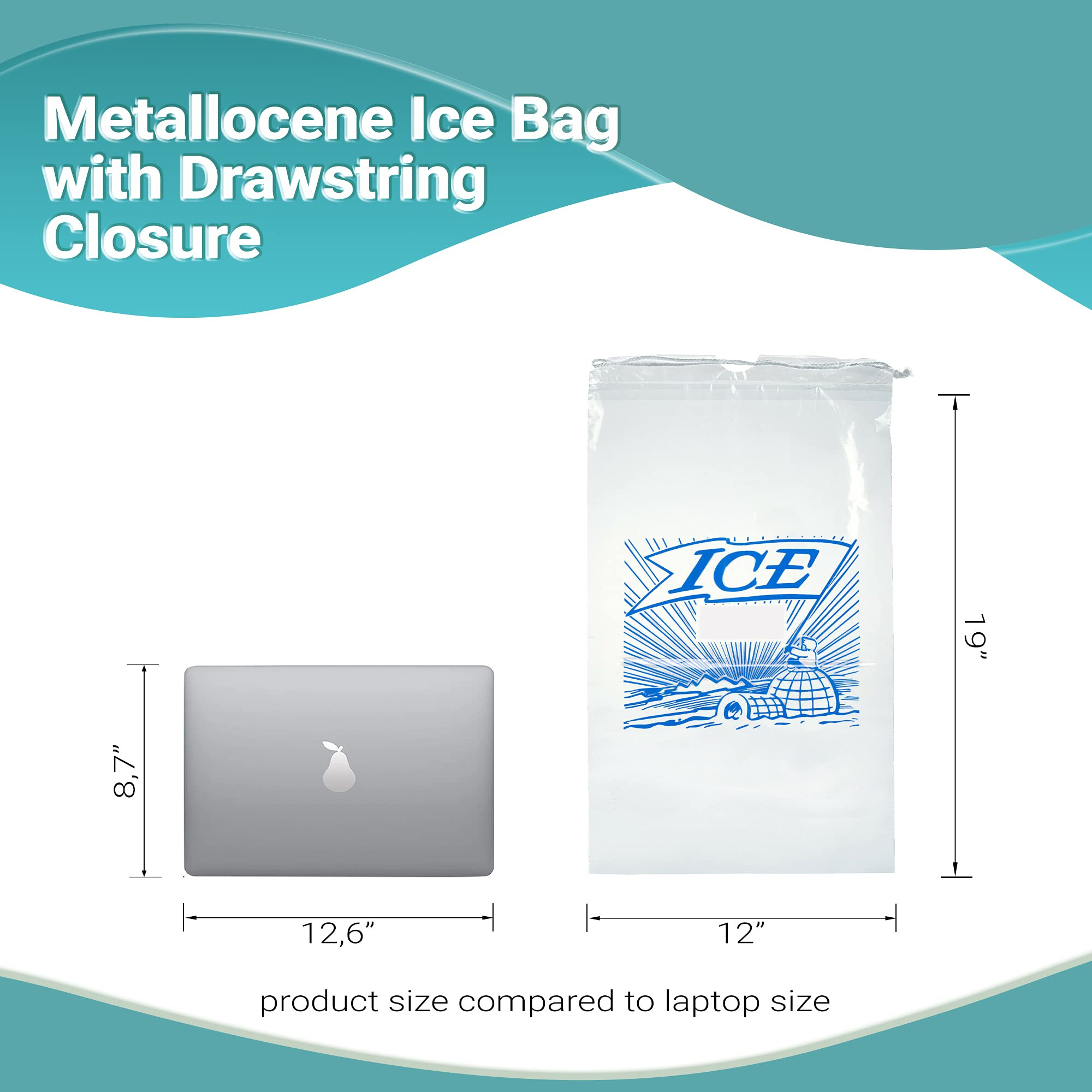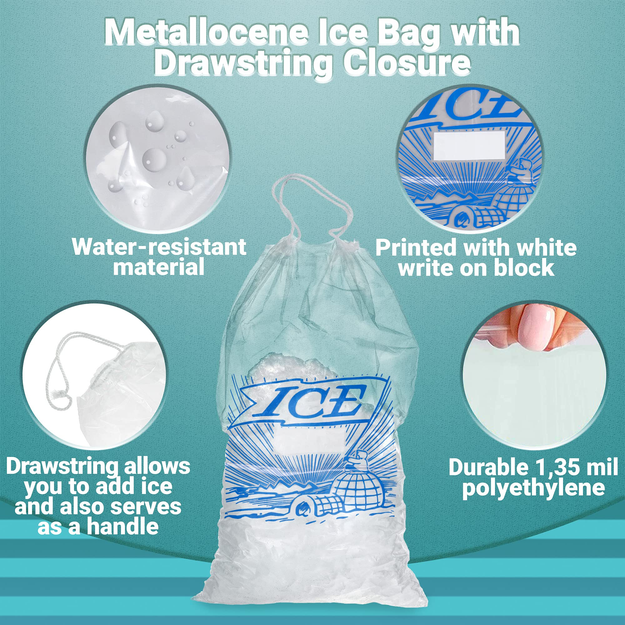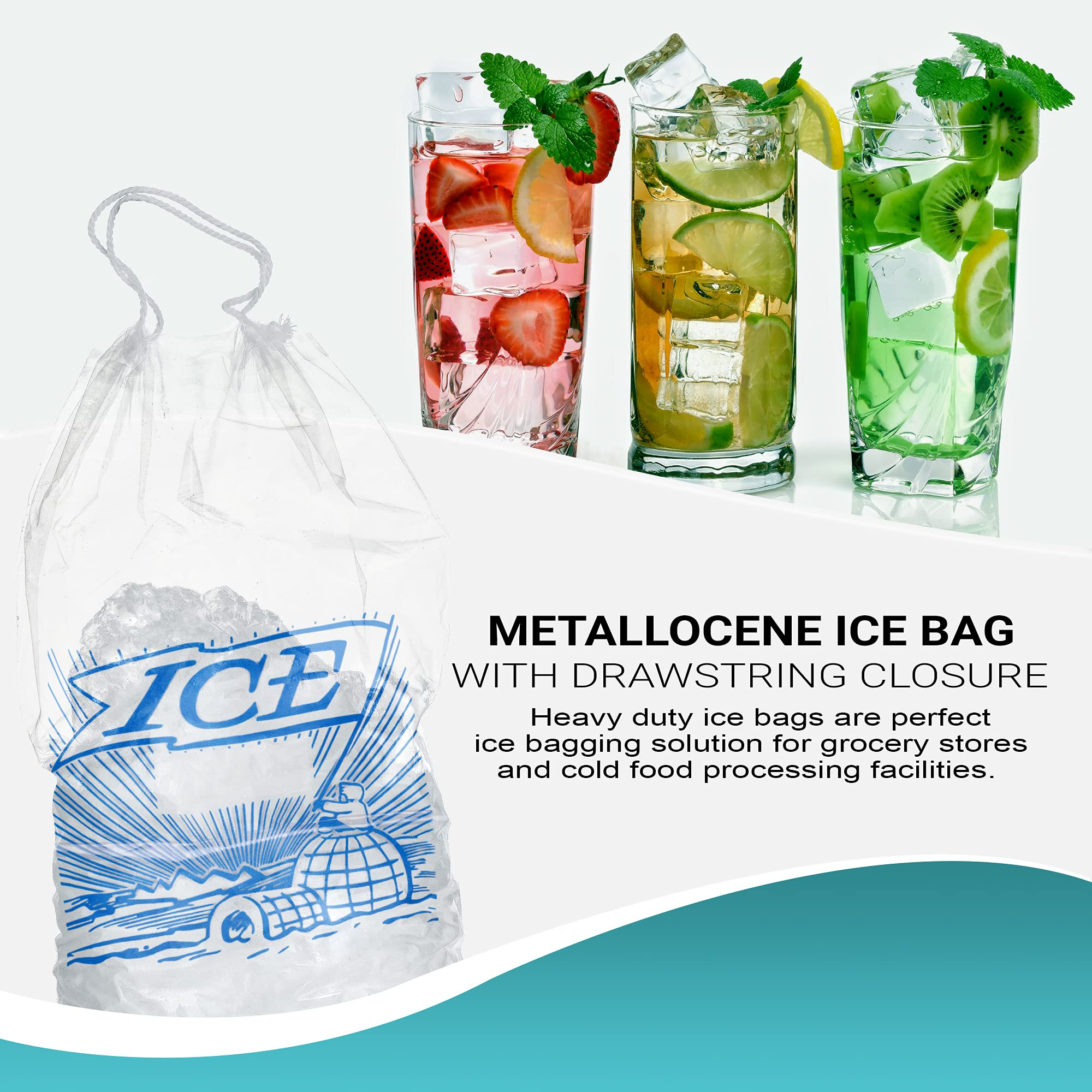 Pack of 500 Printed Metallocene Ice Bags 10 lb, 12 x 19. Polyethylene Bags with Drawstring Closure 12×19. Thickness 1.35 Mil Thick. Ideal for Industrial, Food Service, Health Applications