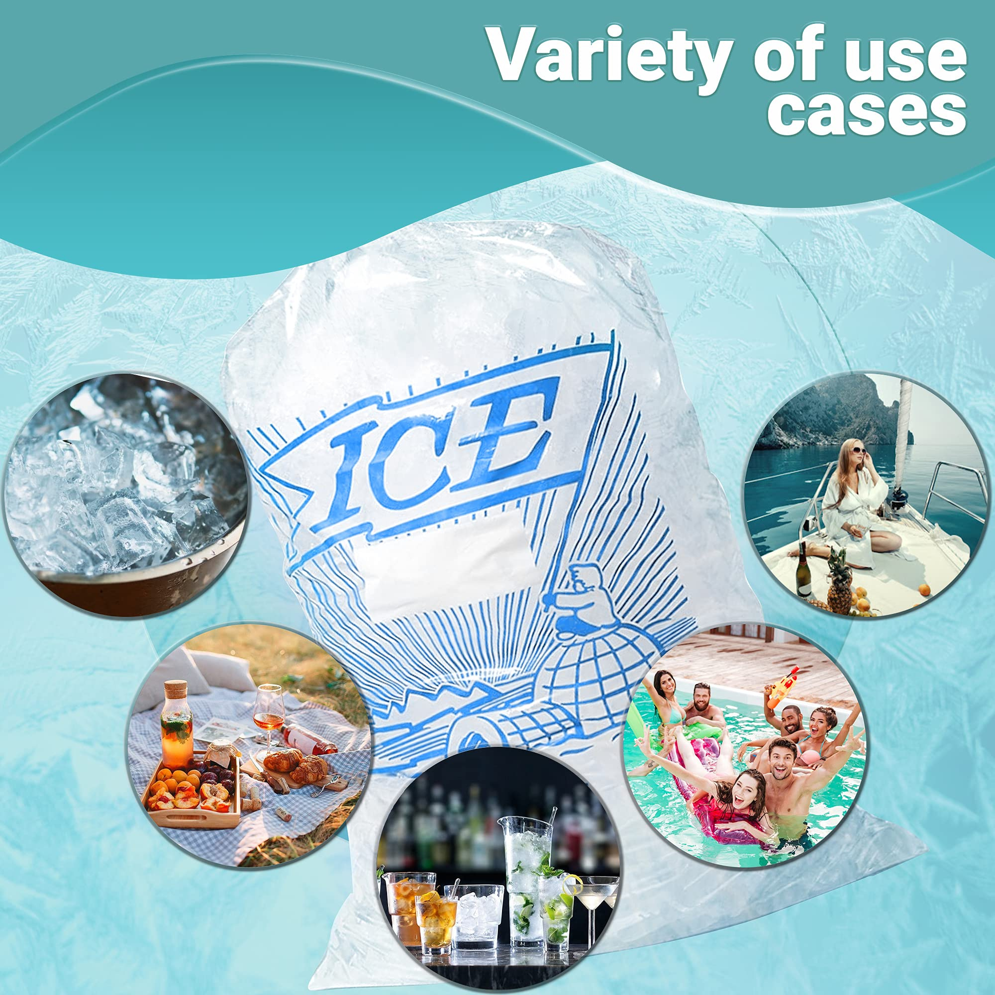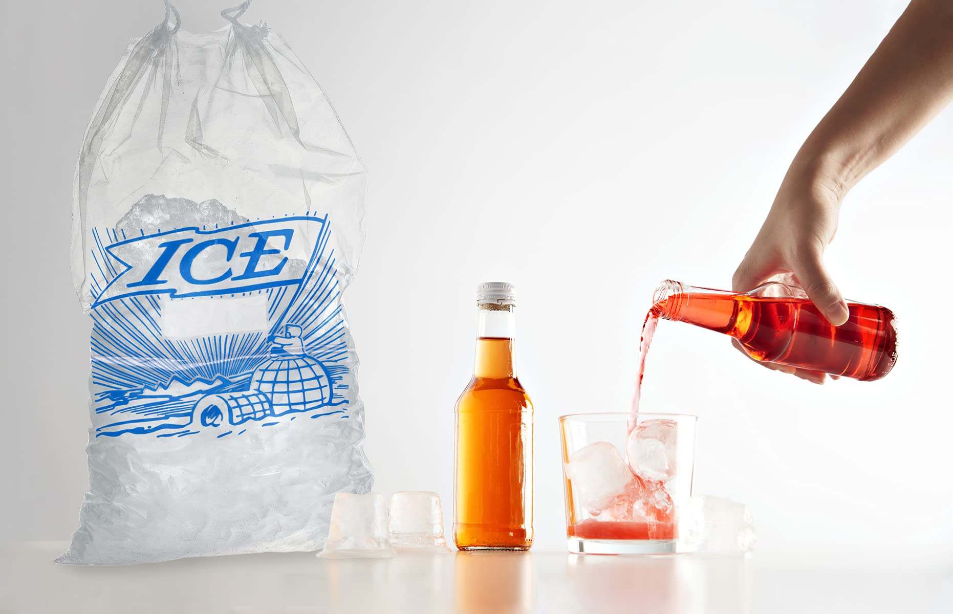 2.High Quality: Ice bags are made from 100% virgin low density polyethylene resin and contain a metalocene additive that gives them exceptional resistance to rips, punctures or tears in extreme cold. Printed ice bags with 1.35 mil thick have high impact strength, high gloss and clarity and excellent durability. Universal polyethylene bags comply with requirements for use in food applications. Poly ice bags feature a drawstring closure that is often preferred for ease of handling and sealing